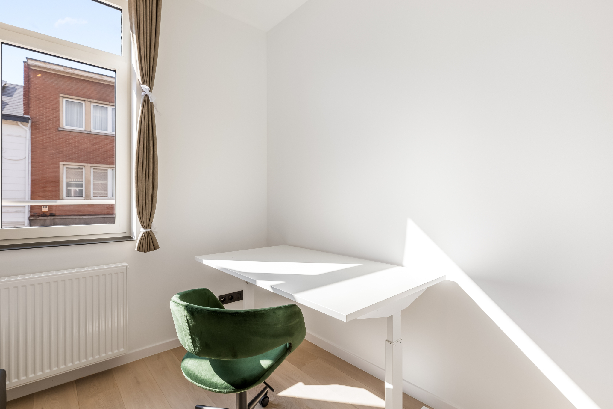Deze kamer is gezellig en modern, met een panoramisch raam dat veel natuurlijk licht binnenlaat. De kamer beschikt over een bureau, een ruime kledingkast en een comfortabel bed. Gelegen in een rustige buurt van Leuven, op slechts een korte afstand van universiteitscampussen en het openbaar vervoer, biedt deze kamer een ideale balans tussen studeren en ontspanning.